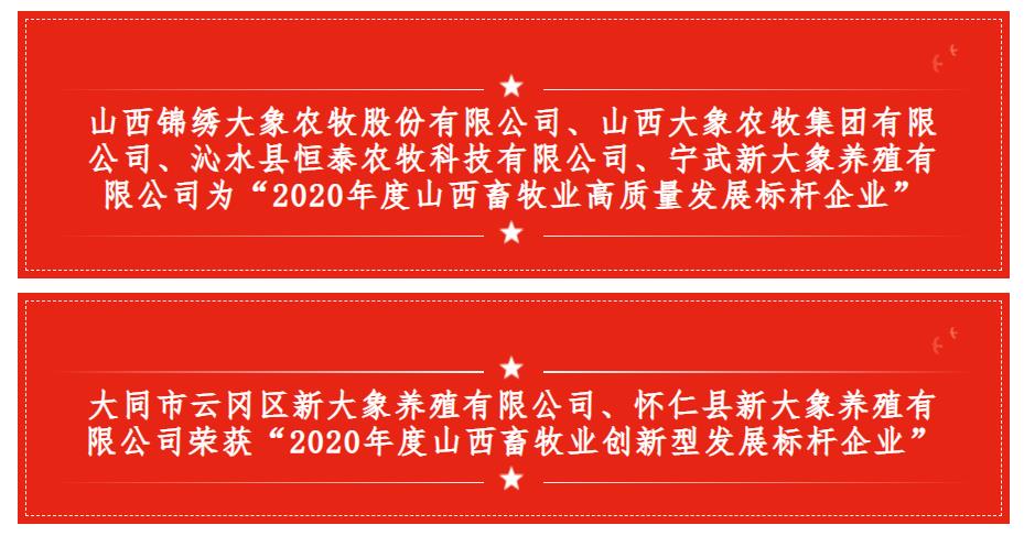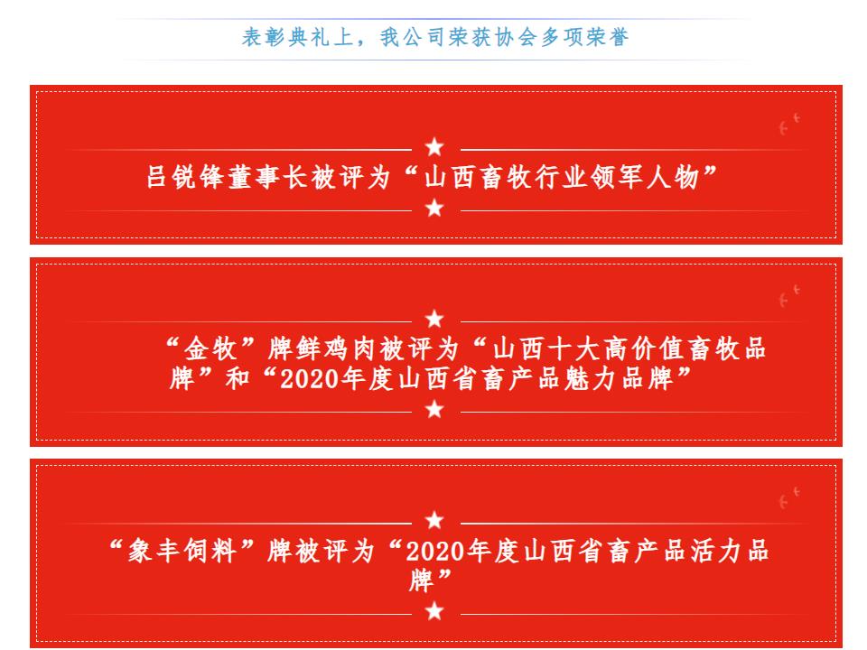 春風(fēng)春雨春分到,春光春景春意濃。2021年3月20日,由山西省畜牧業(yè)協(xié)會(huì)和山西錦繡大象農(nóng)牧股份有限公司聯(lián)合主辦的“晉牧之春,金牛逐夢(mèng)”山西省畜牧業(yè)協(xié)會(huì)2020年度行業(yè)表彰盛典在太原市花園國(guó)際大酒店隆重舉行。畜牧行業(yè)相關(guān)單位的專(zhuān)家、學(xué)者、企業(yè)家代表和新聞媒體共計(jì)260余名應(yīng)邀參會(huì)。在經(jīng)過(guò)協(xié)會(huì)秘書(shū)處初審、專(zhuān)家組評(píng)選,山西省畜牧業(yè)協(xié)會(huì)常務(wù)理事會(huì)研究,我公司選送的多個(gè)項(xiàng)目獲獎(jiǎng),被山西省畜牧業(yè)協(xié)會(huì)表彰。