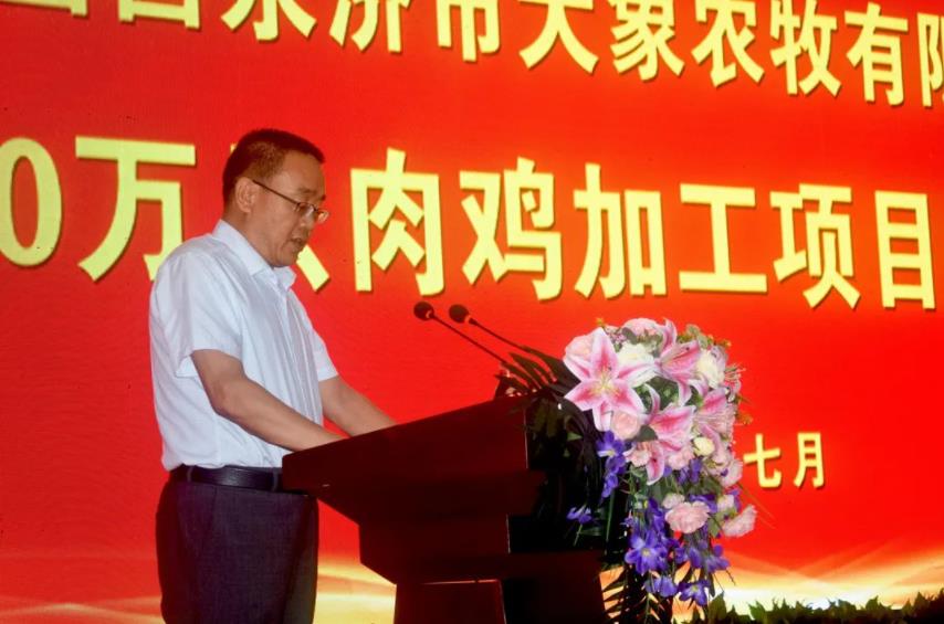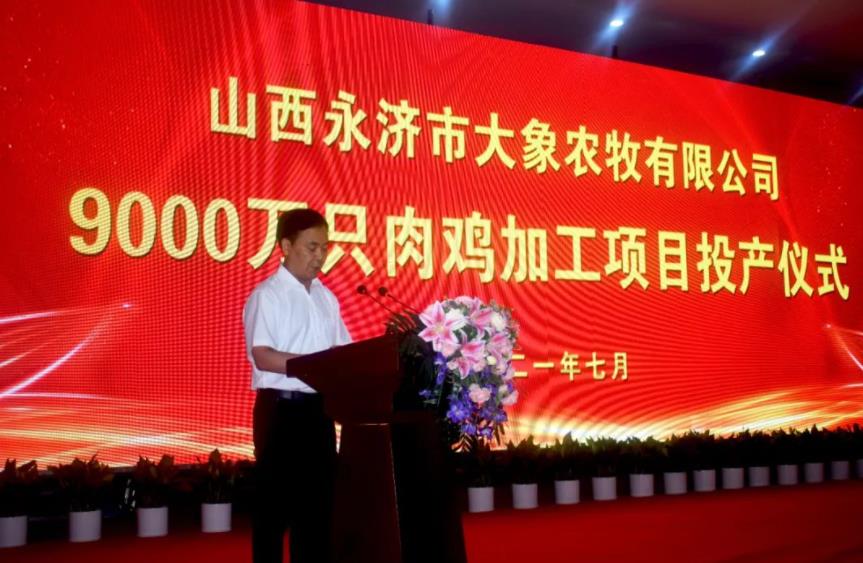 7月的蒲坂大地,樹木郁郁蔥蔥,萬物勃發(fā)。2021年7月21日,山西永濟市大象農(nóng)牧有限公司9000萬只肉雞加工項目正式投產(chǎn)。運城市副市長董旭光,永濟市委書記孫中全,市委副書記、市長黃亞平,市委副書記王文選,市人大常委會主任張立功,副市長衛(wèi)軍、麻亞龍,市政協(xié)副主席邵文龍出席儀式。山西錦繡大象農(nóng)牧股份有限公司董事長呂銳鋒,副總裁劉文革及各公司經(jīng)理人出席。儀式由麻亞龍主持。