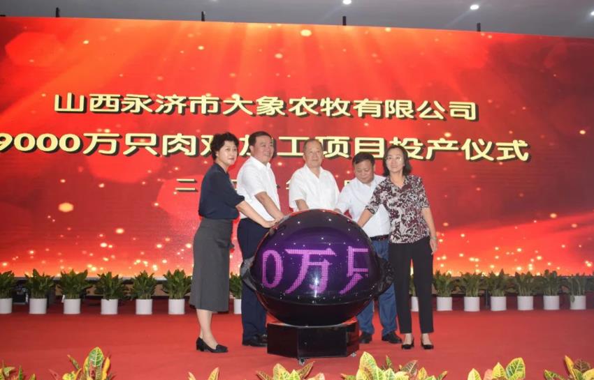 董旭光、孫中全、黃亞平、蘇麗紅、呂銳鋒共同點亮水晶球,宣布山西永濟市大象農(nóng)牧有限公司9000萬只肉雞加工項目正式投產(chǎn)。