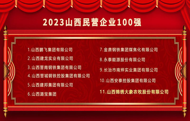 10月19日,在2023山西省民營企業(yè)100強峰會上,山西錦繡大象農(nóng)牧股份有限公司以營收266億元名列民營企業(yè)百強榜單第十一位。