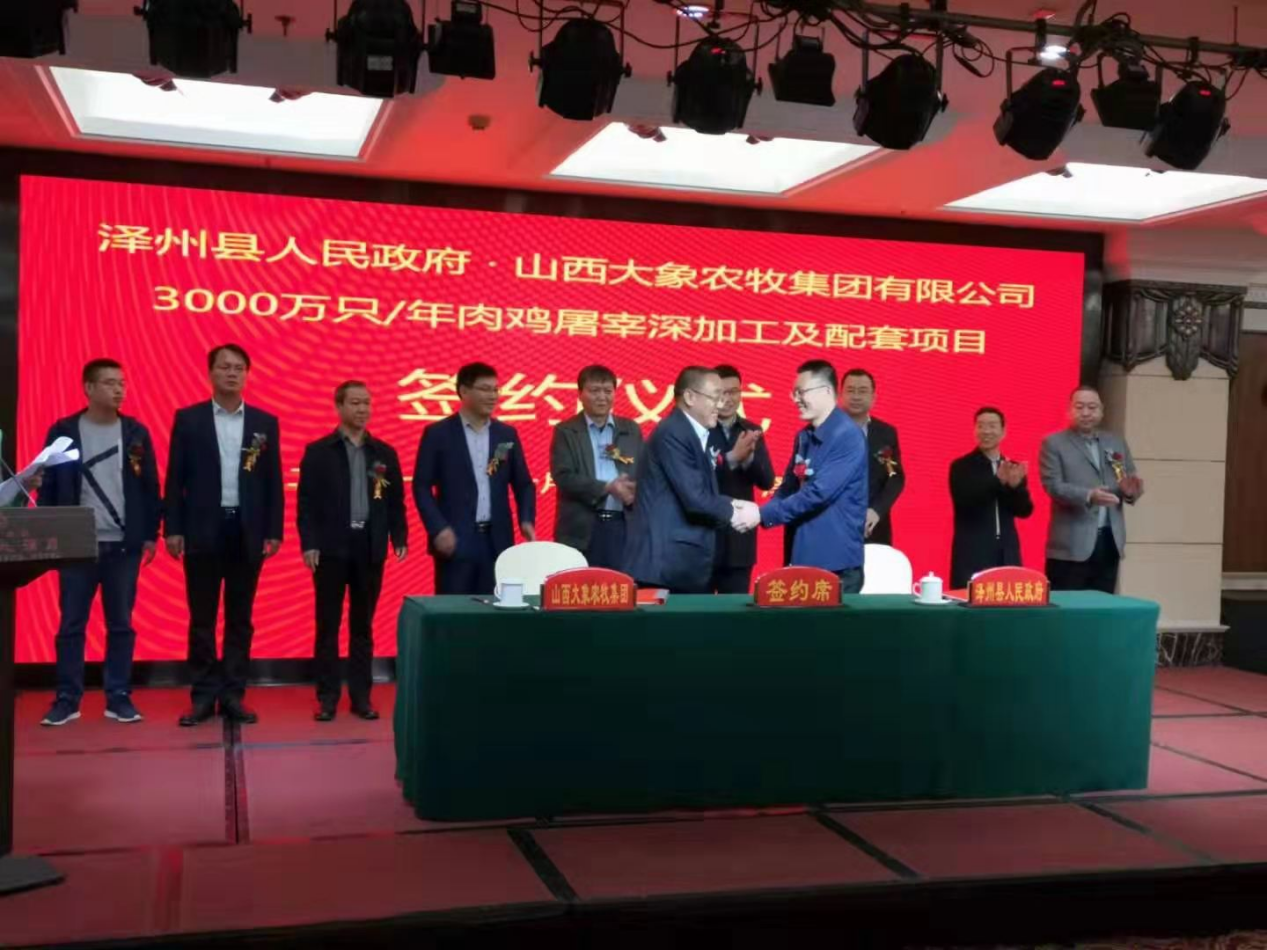2019年10月23,山西大象農(nóng)牧集團(tuán)有限公司與澤州縣人民政府簽約3000萬只/年肉雞屠宰深加工及配套項(xiàng)目。澤州縣委副書記任小廣、副縣長(zhǎng)張翀、山西大象農(nóng)牧集團(tuán)有限公司總裁劉文革、副總裁孫治水、晉東南一體化總經(jīng)理黃虎平、沁水一體化總經(jīng)理侯華帥以及縣各職能部門領(lǐng)導(dǎo)出席了簽約儀式。