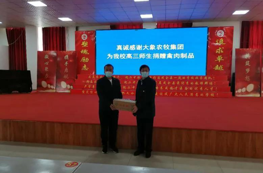 去年以來,山西大象農(nóng)牧集團(tuán)對文水二中一直給予熱情關(guān)心和鼎力支持。此次在全校上下眾志成城、抗擊新冠肺炎疫情暨高三開學(xué)封閉管理的關(guān)鍵時期,山西大象農(nóng)牧集團(tuán)再次慷慨解囊、無私捐贈禽肉制品,極大鼓舞了文水二中師生的信心和決心,充分體現(xiàn)了山西大象農(nóng)牧集團(tuán)強(qiáng)烈的社會責(zé)任感和心系教育的高尚情懷。邢長明說,學(xué)校將加強(qiáng)領(lǐng)導(dǎo)、有效統(tǒng)籌,確保把企業(yè)的愛心捐贈用于校園疫情防控和高三沖刺第一線,切實(shí)增強(qiáng)全體師生的幸福感,推動高三師生凝心聚力,沖刺高考,再創(chuàng)佳績。同時,會切實(shí)守護(hù)好廣大師生的安全,堅(jiān)決打贏疫情防控阻擊戰(zhàn),立德樹人,務(wù)本求真,實(shí)干興校,不斷提升辦學(xué)品位,培養(yǎng)出更多的優(yōu)秀人才。